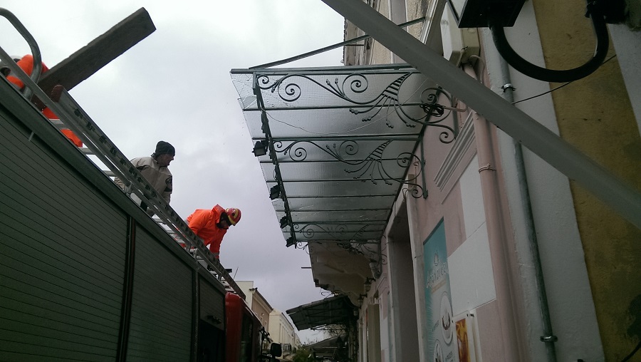 Στην Χώρα ο αέρας έριξε τα μαδέρια από την σκαλωσιά που είχε αναρτηθεί στο κτίριο που στεγάζει την επισκοπή. Η πυροσβεστική που εκλήθη βοήθησε να μαζευτούν τα πράγματα.