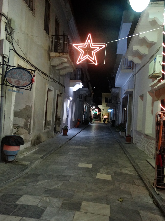 Ο πεζόδρομος γιορτινός, κατάφωτος κι άδειος. Όμως οι άνθρωποι στον Όρμο πλήρεις συναισθημάτων! Το καταλαβαίνεις όταν αργά επιστρέφοντας μόνος τον δρόμο για Χώρα χτυπά το τηλέφωνο. Είναι ο Νίκος από την Λιθοδομή: "είδα το αυτοκίνητο σου απέξω. Είχα δουλειά δεν σε είδα που μπήκες-βγήκες. Να τα πούμε μέσα στη βδομάδα στη Χώρα"! Τον Νίκο τον ξέρω από τις λίγες επισκέψεις μου στη Λιθοδομή. Έκανε το άλμα να έρθει να στεριώσει στον μικρό Όρμο από τον μεγάλο Πειραιά. Και μόνο αυτό φτάνει!...