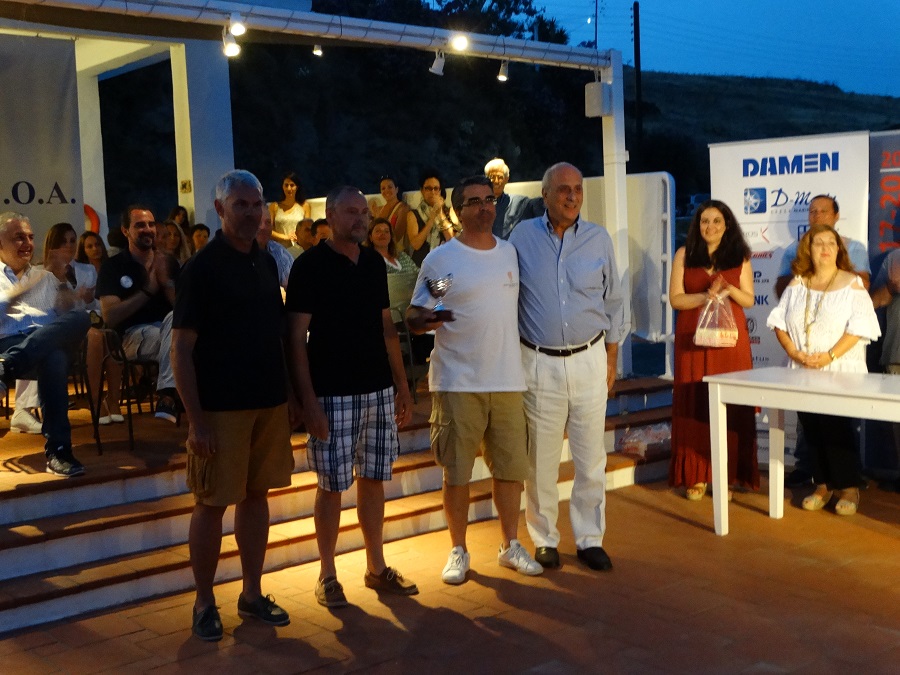 Ο Αδαμάντιος Πολέμης μετά την απονομή του κυπέλου στον κυβερνήτη Νίκο Σίμπουρα για την επιτυχία στην κατηγορία του (φωτο: Εν Άνδρω).