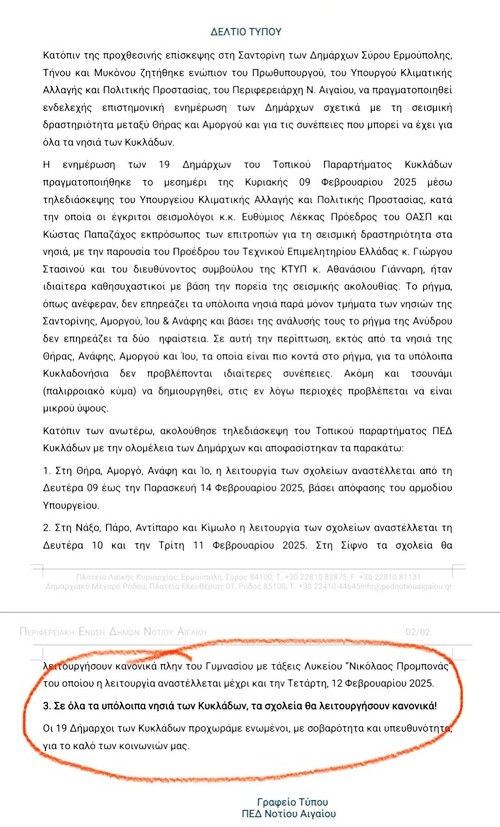 Ανοιχτά τα σχολεία στην πλειοψηφία των νησιών στις Κυκλάδες από αύριο Δευτέρα 10/2. Ανοίγουν και στην Άνδρο. Αντιθέτως θα παραμείνουν κλειστά σε Θήρα, Αμοργό, Ανάφη, Ίο. Επίσης σε Πάρο, Νάξο, Αντίπαρο, Κίμωλο.