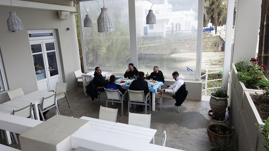 Και το πιο εντυπωσιακό: με κύμα και βοριά ο Νικόλας στα Γυάλια, αν και εξοχικός ήταν και ανοικτός κι είχε τρεις-τέσσερις παρέες! Δευτέρα μεσημέρι! Με βοριά και με μποφόρια καλοτρώγανε τ΄ αγόρια! Όχι παίζουμε. Φωτογραφίσαμε την παρέα των νέων που έμεινε περισσότερο. Άνετοι πίσω από την πλαστική κουρτίνα της κάτω αυλής να κόβει τον αέρα. Τελικά αν και αποκλεισμένοι δεν περνάμε άσχημα. Κι έπεται συνέχεια γιατί υπάρχει απαγορευτικό και την Τρίτη...