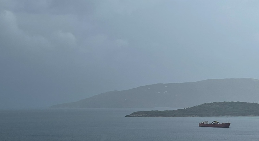 Βροχή είχε και στο Γαύριο και στον Κάτω Άγιο Πέτρο. Το μικρό σκάφος με τον γερανό είχε μείνει στ' ανοιχτά στον Κυπρί περιμένοντας να σπάσει ο καιρός. Κάτι που πήρε άλλο ένα 24ωρο...