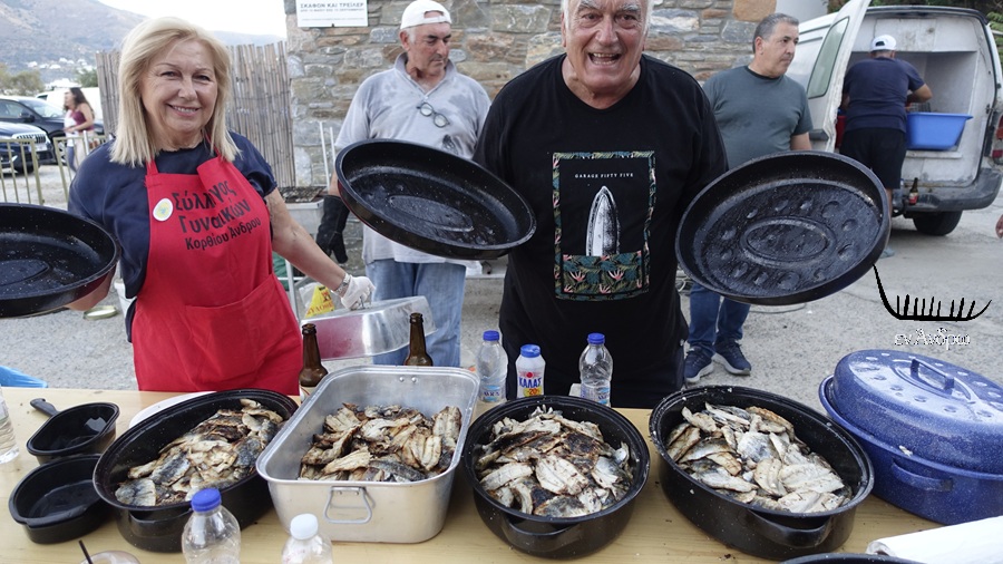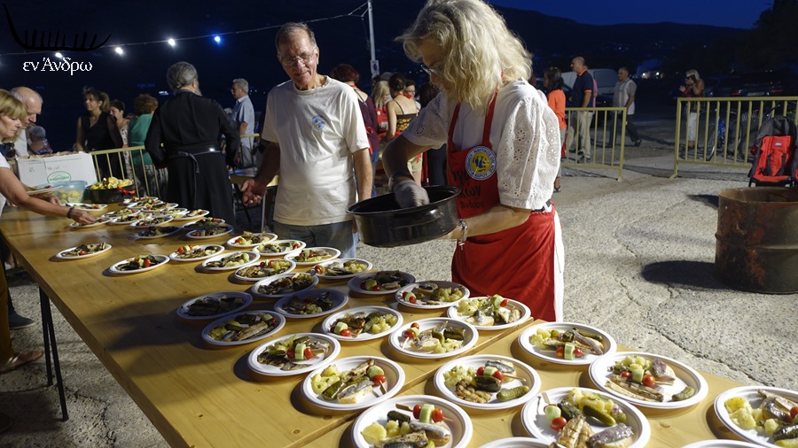 Άρα η ψαράδικη βραδιά ήταν μια καλή ευκαιρία για τους ανδριώτες να αφήσουν στην άκρη τα λουκάνικα και τη λούζα και να εστιάσουν στη σαρδέλα και στον γαύρο. Και οι ανδριώτες ανταποκρίθηκαν μαζικά στο κάλεσμα. Οι σαρδέλες στα κάρβουνα, λοιπόν, ήταν η τέλεια αναφορά του εξωτικού γεγονότος για να έχουμε το αρχικό μενού της επιτυχίας της βραδιάς.. Προσθέστε τώρα στο μενού την δραστήρια εθελοντική παρουσία (α) του Αλιευτικού Συλλόγου Άνδρου, (β) του Συλλόγου Γυναικών Κορθίου, (γ) του Ναυτικού Ομίλου Κορθίου και (δ) του πανταχού παρόντος πατέρα Αετίου της Μονής Παναχράντου και θα έχετε την πλήρη συνταγή της μεγάλης επιτυχίας της βραδιάς.