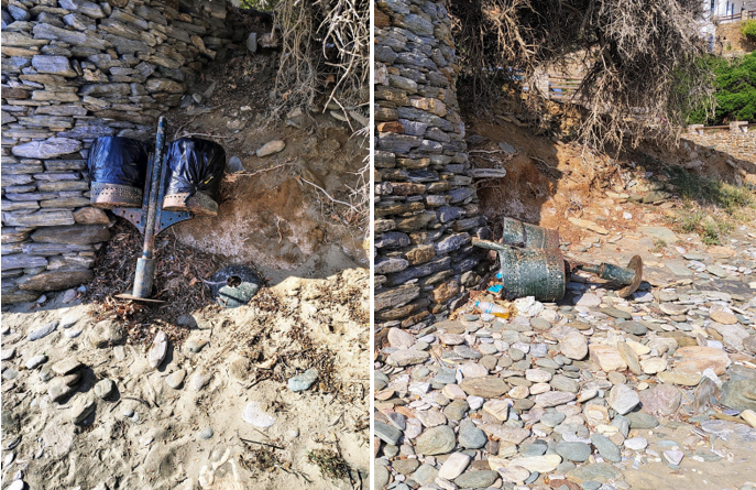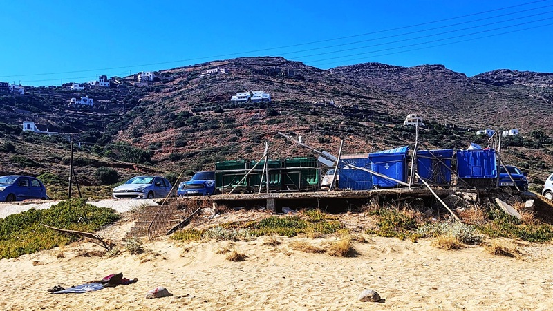 Δεύτερον, τουλάχιστον πριν λίγα χρόνια αυτούς τους κάδους σκουπιδιών κάλυπτε μια πρόχειρη κατασκευή από καλάμι προκειμένου να μην τους βλέπουν οι επισκέπτες την ώρα που απολαμβάνουν την παραλία και τα πεντακάθαρα νερά της.