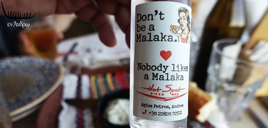 Χαρακτηριστικό το χιουμοριστικό καρτελάκι που ήταν πάνω του κι έγραφε σε άψογα αγγλοελληνικά "Don't be a malaka" - "Nobody likes a Malaka"! Με την υπογραφή: Hot-Spot / pizza-bar / Agios Petros, Andros!...