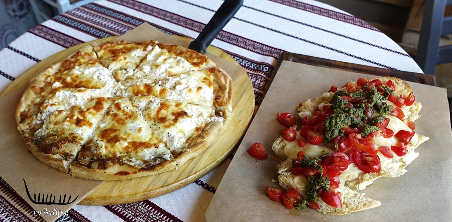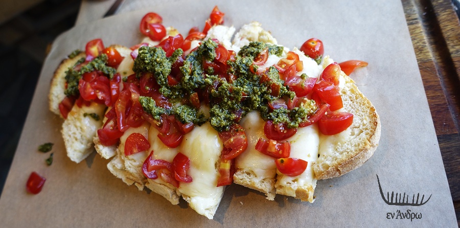 Μετά αφίχθηκε η βρουσκιέτα με τυρί παρμεζάνα, μοτσαρέλα και πέστο. Εκεί είδαμε τη δεύτερη διαφορά. Το υπόστρωμα του ψωμιού ψημένο υπέροχα σχημάτιζε σώμα με το τυρί. Κι από πάνω πέστο και ντοματίνια... Η γεύση απίστευτη. Ήταν το υπέροχο ψωμί - παρασκευής Γιώργου Συρίγου - που έδενε εντυπωσιακά με το λιωμένο τυρί...