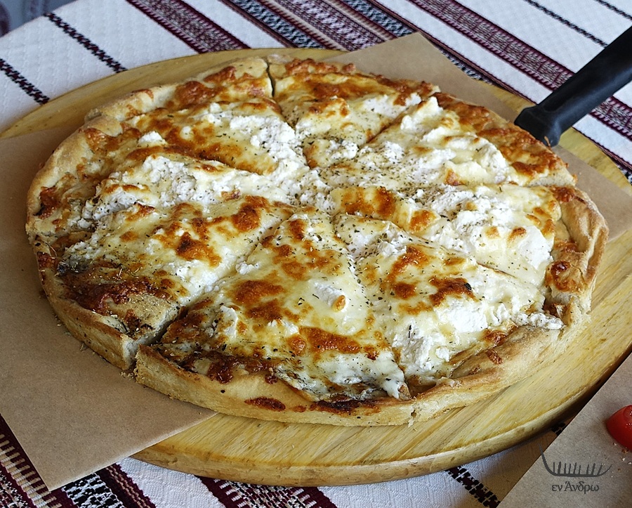 Και μετά ήρθε η "ντόπια πίτσα". Με ντόπιο μαλακό ντόπιο τυρί και από πάνω συνδυασμός άλλων τεσσάρων τυριών. Κάτι σαν τούρτα καλοψημένη! Υπέροχο το ζυμάρι στη βάση της πίτσας. Και το ντόπιο τυρί πλούσιο με όλη του την κρέμα έδινε την αίσθηση μιας γευστικής μοναδικότητας. Μιλάμε για κάτι τόσο ξεχωριστό με πλούσια γεύση και συνάμα ανάλαφρο! Για να πετύχει το ζυμάρι της πίτσας ζυμώνει τέσσερις με έξι φορές τη μέρα ζύμη, για να είναι φρέσκια. Όπως εξήγησε το μυστικό στην πίτσα είναι η φρεσκάδα και το ανάλαφρο της ζύμης. Από εκεί και πέρα αναλαμβάνει το ντόπιο ανδριώτικο τυρί με την πλούσια υφή του, που δημιουργεί μια γευστική πανδαισία.