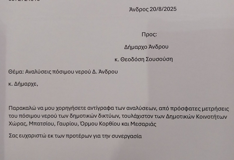 (Λάβαμε και δημοσιεύουμε δύο έγγραφα για το νερό. Το πρώτο έχει ημερομηνία 4 Αυγούστου της Δημοτικής Κοινότητας Κορθίου και αναφέρεται σε διευκρινήσεις σχετικά με το νερό γεώτρησης στ' Αϊπάτια, την χρήση του και την καταλληλόλητα του. Το δεύτερο έχει ημερομηνία 20 Αυγούστου και είναι επίσημα ερωτήματα προς τον δήμαρχο Άνδρου από τον δημοτικό Σύμβουλο Κ. Θωμά και ζητά να δοθούν στη δημοσιότητα οι πρόσφατες αναλύσεις του Δήμου για το νερό στις περιοχές Χώρας, Γαυρίου, Μπατσίου, Κορθίου και Μεσαριάς. Με δεδομένη την γνώση όλων περί της ποιότητας του νερού που τρέχει από τις βρύσες είναι λογικό να δοθούν και για τα δύο έγγραφα απαντήσεις από τον δήμαρχο - ΕΝ ΑΝΔΡΩ)