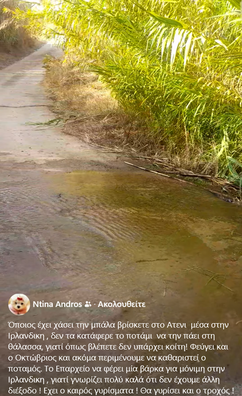 Ένα ακόμα ρέμα που - όπως γράφουν οι κάτοικοι - δεν καθάρισε η έπαρχο Άννα Βρεττού. Και πλημμύρισε ο δρόμος - πάλι σύμφωνα με την καταγγελία των περιοίκων. Γράφουμε πολύ προσεκτικά για τις καταγγελίες των περιοίκων και των κατοίκων γιατί η κ. Βρεττου σε περσινή καταγγελία περιοίκων της, που δημοσιεύσαμε επιχείρησε με μηνύσεις να σταματήσει την όποια πολιτική κριτική τις άσκησαν και τις ασκήσαμε. Έχουμε την εντύπωση πως θα περάσει μεγάλο μέρος της θητείας της αντιδικώντας στα δικαστήρια, προσπαθώντας να αποσιωπήσει τις όποιες καταγγελίες κατοίκων και περιοίκων. Τι είδους έργο είναι αυτό από την μεριά της δεν το κατανοούμε. Και τι θα καταφέρει μέχρι το τέλος της θητείας της δεν το καταλαβαίνουμε. Αν κρίνουμε όμως πως χρεώνεται πολιτικά και διοικητικά - μετά τις στραβοτοποθετημένες μπάρες - και τα μη καθαρισμένα ρέματα, τότε κάτι δεν έχει καταλάβει τίποτα από τον πολιτικό και διοικητικό ρόλο που ανέλαβε.