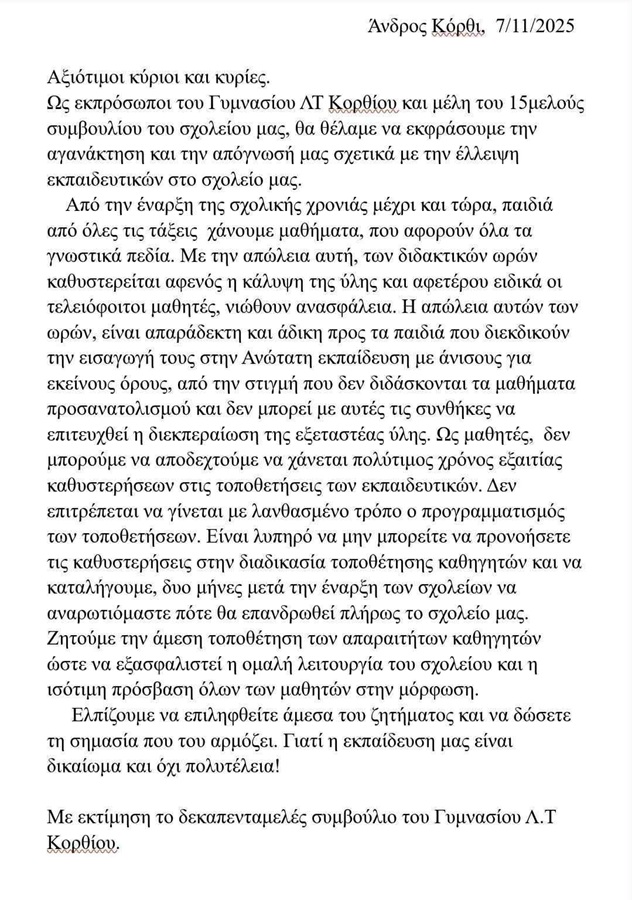 Ο Σύλλογος Γονέων και Κηδεμόνων του Γυμνασίου - Λυκείου Κορθίου, εκφράζει την έντονη ανησυχία και αγανάκτησή του για την συνεχιζόμενη έλλειψη εκπαιδευτικών στο σχολείο μας, γεγονός που έχει ως αποτέλεσμα την αδυναμία ομαλής λειτουργίας και τη σοβαρή υποβάθμιση της εκπαιδευτικής διαδικασίας.