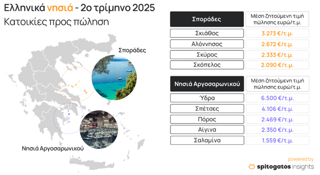 Εκρηκτική άνοδο εμφανίζουν οι τιμές για αγορά κατοικίας στα ελληνικά νησιά την τελευταία εξαετία και ιδίως μετά το 2022, ξεπερνώντας σε ορισμένες περιοχές των Κυκλάδων αλλά και στην Υδρα τα 5.000 ευρώ ανά τετραγωνικό. Σύμφωνα με στοιχεία του Spitogatos Insights για τη διεθνή ζήτηση, οι πέντε κορυφαίες χώρες με το μεγαλύτερο ενδιαφέρον για κατοικίες στα ελληνικά νησιά είναι οι ΗΠΑ, το Ηνωμένο Βασίλειο, η Γερμανία, η Ολλανδία και η Γαλλία.