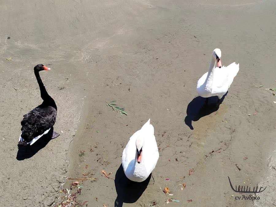 Διασταυρώσεις στο Νειμποριό. Οι άσπροι και ο μαύρος κύκνος στο Νειμποριό. Ο μαύρος τους κοιτά με περιέργεια. Οι άσπροι τον αγνοούν τελείως κοιτώντας από την άλλη.