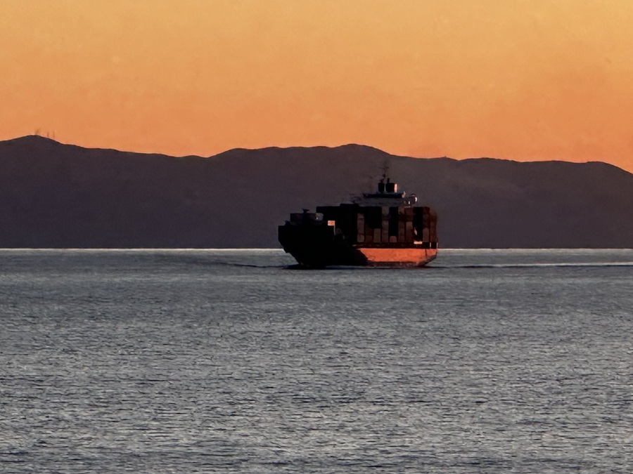 ΛΗΨΗ ΤΟ ΑΠΟΒΡΑΔΟ: Επιστρέφω με το ίδιο πλοίο. Κουρασμένος, κοιτώ αφηρημένα από το τζάμι τον Κάβο Ντόρο. Ένα πλοίο με κοντέινερ ανεβαίνει το πέρασμα. Η κοκκινωπή διαφάνεια του στενού εντυπωσιάζει. Επιχειρώ μια ακόμα φωτογραφία. Από την Άνδρο προς το νότο. Κοιτώ την φωτογραφία και δεν πιστεύω στα μάτια μου. Το πλοίο σαν πίνακας κυβιστών ζωγράφων. Και το σκοτεινό φόντο των βουνών πίσω του μια περίεργη σκιαγράφηση. Σαν ζωγραφική μικρού παιδιού ή σαν πίνακας κάποιου μεγάλου κι αόρατου ζωγράφου. Η μέρα που ξεκίνησε ολόφωτη και διάφανη κλείνει με μια ξεχωριστή ζωγραφική κατάληξη. Ζούμε σε μια ευλογημένη γωνιά της Ελλάδας. Ζούμε σε μια ξεχωριστή χώρα...