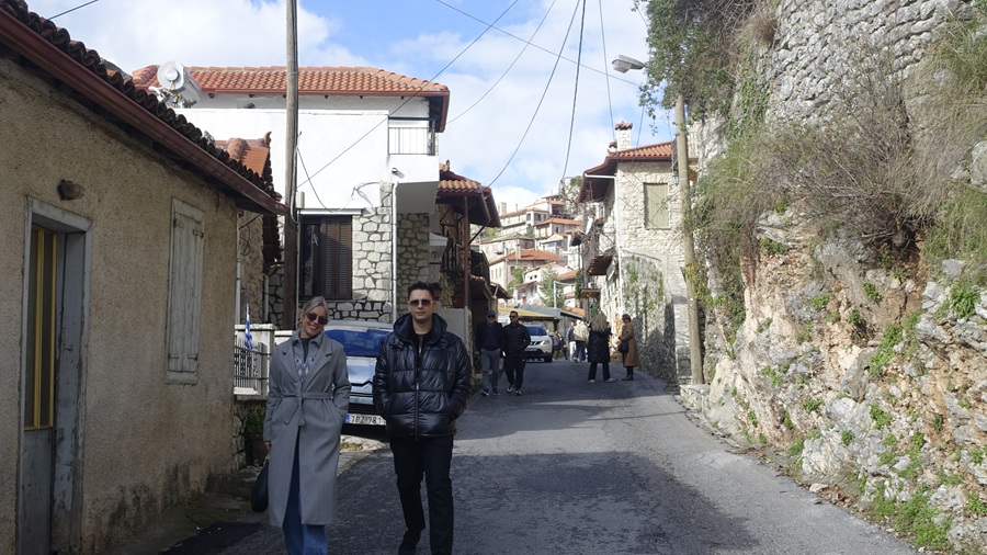 Ο κεντρικός δρόμος του ιστορικού χωριού έχει κόσμο. Και ωραίο κόσμο. Χαμογελαστό μπροστά στον φακό της μηχανής. Αυτοκίνητα και πεζοί στριμώχνονται. Τα πούλμαν δεν χωράνε. Κάνουν ώρα να περάσουν. Κι είναι και πολλά...