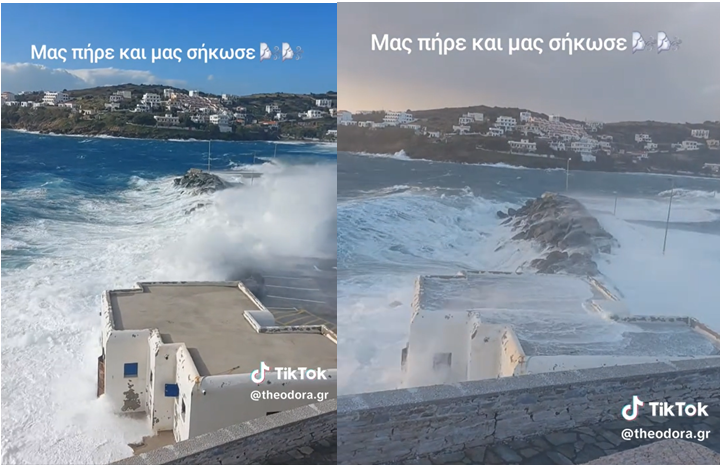 Από την επέλαση του νοτιά το Σάββατο 10/1/26 στην Άνδρο και στην Τήνο ο αναγνώστης Δημήτρης Σταυρόπουλος, δημοσιογράφος, αλίευσε κι έστειλε 3 εντυπωσιακά βίντεο που βρήκε στο Tik-Tok, τα οποία αποτυπώνουν την απίστευτη διαδρομή των κυμάτων στο Μπατσί της Άνδρου και στη Χώρα της Τήνου.