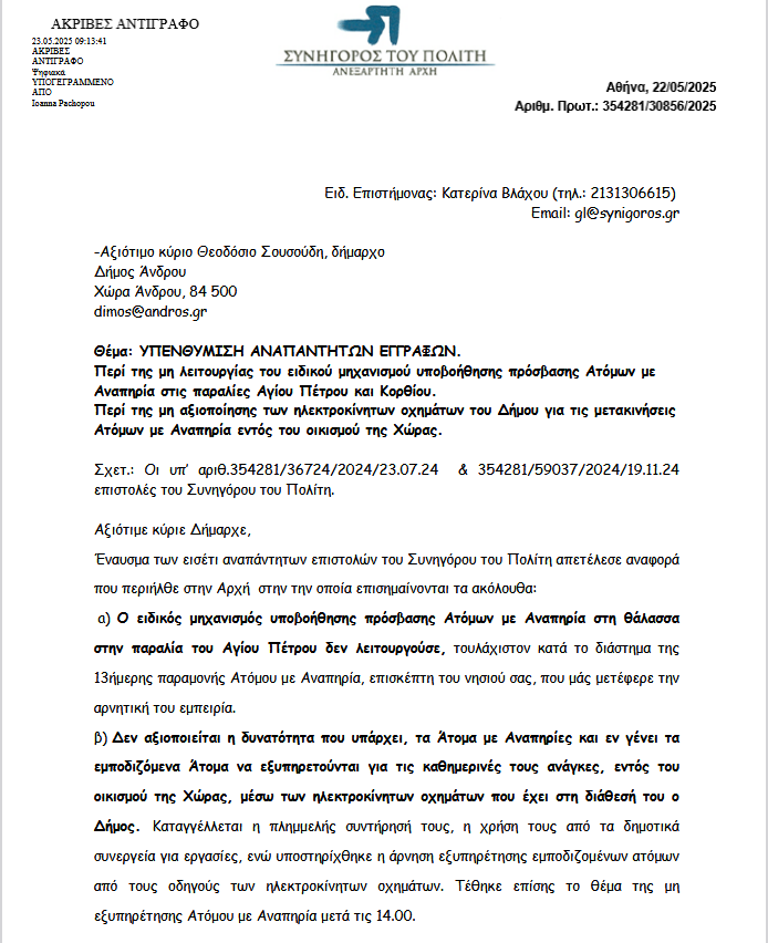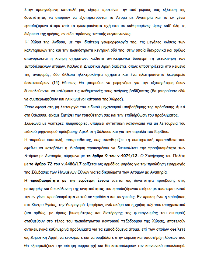 Συνημμένα θα βρείτε την Υπενθυμιστική επιστολή του Συνήγορου του Πολίτη για τις Αναφορές που έχω υποβάλει κατά του Δήμου Άνδρου για την πλημμελή παροχή διευκολύνσεων προς τους ΑμεΑ - τόσο για τις 2 καταγγελλόμενες περιπτώσεις των Μηχανισμών Υποβοήθησης στην κολύμβηση των ΑμεΑ (στην παραλία Αγίου Πέτρου το 2024 και σε αυτή του Όρμου Κορθίου το 2025) όσο και για το διαρκές και χρονίζον πρόβλημα της μη διάθεσης οχημάτων μεταφοράς των ΑμεΑ κατά μήκος των πεζοδρομημένων οδών (κύρια της Χώρας) ενώ θεωρητικά υπάρχει επάρκεια των δωρηθέντων ηλεκτροκίνητων οχημάτων.
