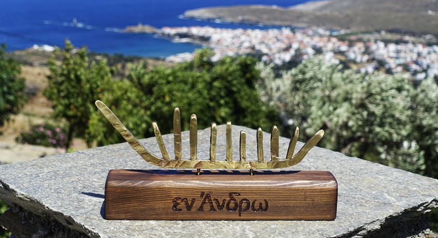 Πριν μερικά χρόνια ο χρυσοχόος και επεξεργαστής μετάλλων Ευτύχης σμίλεψε στο "καρνάγιο" του στο Μπατσί το χάλκινο καραβάκι προσφορά στο "εν Άνδρω". Μάς προσκάλεσε σε μια γιορτή - πριν μερικά χρόνια με τυχαία παρουσία συνεργείου της ΕΡΤ - και μάς το απένειμε. Σε μια σεμνή τελετή λίγων φίλων γύρω από ένα γιορταστικό τραπέζι. Ήταν ένα ξεχωριστό δώρο, αλλά συνάμα και μια μικρή αναγνώριση μας στις ρότες της Άνδρου...