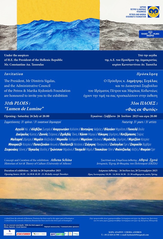 "Φως εκ φωτός"...Στα 31 χρόνια εκθέσεων του Ιδρύματος Κυδωνιέως 31 εικαστικοί καλλιτέχνες παρουσιάζουν δημιουργίες τους στη ζωγραφική, στη γλυπτική, στην χαρακτική, στα κεραμικά, στη φωτογραφία και στις παραστατικές τέχνες. Τα εγκαίνια θα γίνουν το Σάββατο 26/7 στις 20:00 στο κτίριο του Ιδρύματος Κυδωνιέως.