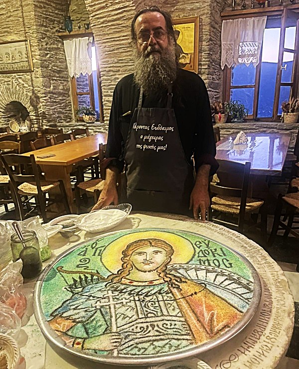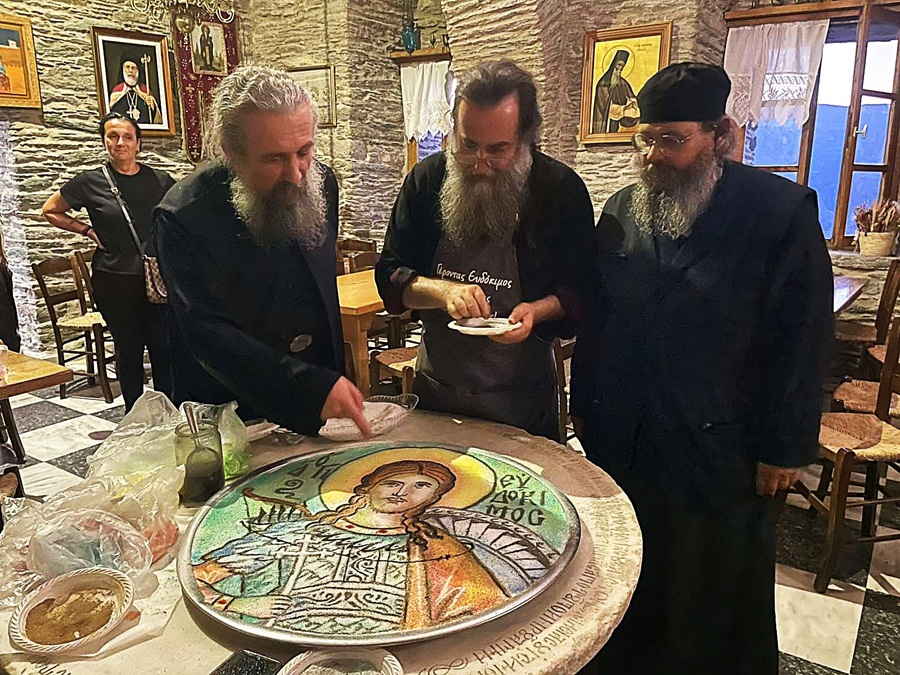 Ο λόγος για τον μοναχό Ιωσήφ από το Άργος που έφτασε στο μοναστήρι για να παρασκευάσει/κατασκευάσει αυτό το μοναδικό έργο τέχνης που φτιάχνετε μόνο στην εορτή των Αγίων σε πολλά μοναστήρια που εορτάζουν. Και ο πατήρ Ιωσήφ από το Άργος ήρθε για να τιμήσει τον Γέροντα Ευδόκιμο που εορτάζει στις 31 Ιουλίου ήμερα που τιμάται η μνήμη του Άγιου Ευ δοκίμου. Ση φωτογραφία ο καλλιτέχνης πατήρ Ιωσήφ και το ψηφιδωτό έργο του παρασκευασμένο με κόλλυβα...