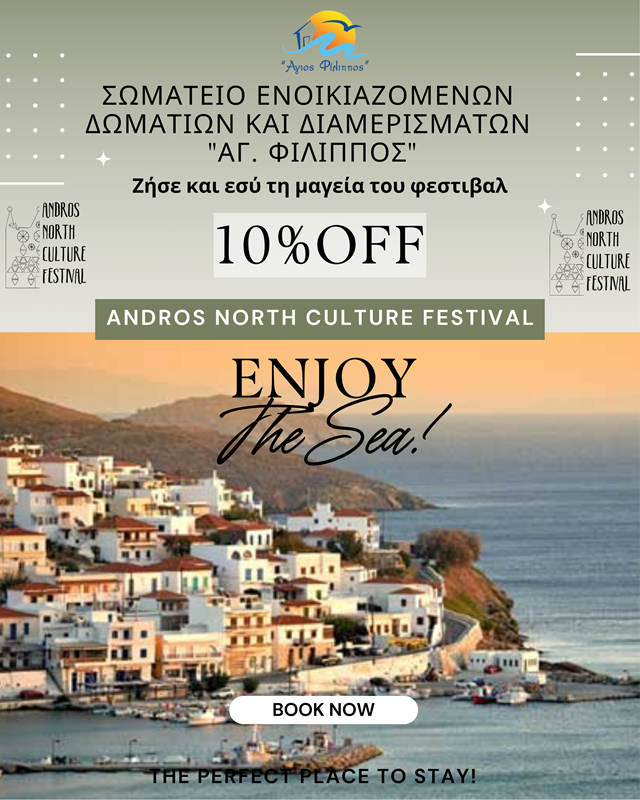 (Με χαρά υποδεχόμαστε το 1ο Φεστιβάλ Πολιτισμού Βόρειας Άνδρου. Η μέχρι χθες "ξεχασμένη" από πολλούς Βόρεια Άνδρος (όχι όμως από το Εν Άνδρω) βγαίνει μπροστά εφέτος και διοργανώνει το δικό της Φεστιβάλ Πολιτισμού. Εκεί που όλοι και όλα τελειώνουν - στο τέλος Αυγούστου, η Βόρεια Άνδρος ξεκινά το δικό της Φεστιβάλ με στόχο να επεκτείνει την σεζόν, αλλά και να επεκτείνει την Άνδρο! Το πιο "ξεχασμένο" κομμάτι της Άνδρου είναι εδώ πλέον για να επεκτείνει την παρουσία του νησιού.