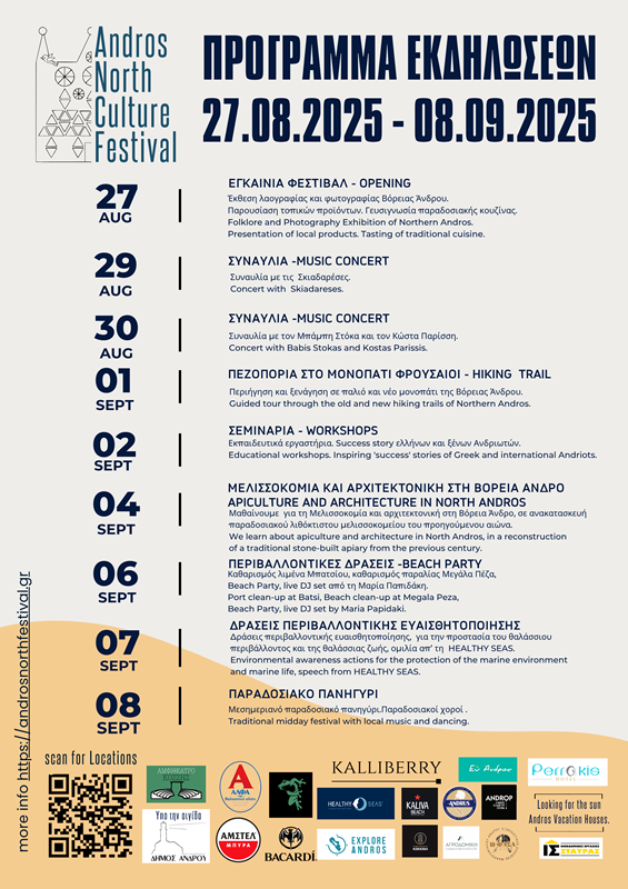 Η καρδιά της πολιτιστικής και φυσικής κληρονομιάς της Βόρειας Άνδρου χτυπά δυνατά αυτή τη χρονιά στο Andros North Culture Festival 2025, μία πολυθεματική διοργάνωση αφιερωμένη στη σύνδεση των γενεών, τη βιώσιμη ανάπτυξη, τη συλλογική δράση και την ανάδειξη του φυσικού τοπίου και του τοπικού πολιτισμού.