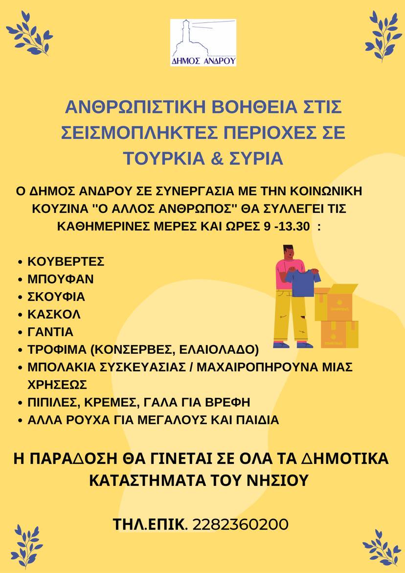 Ο ΔΗΜΟΣ ΑΝΔΡΟΥ στα πλαίσια της μεγάλης κινητοποίησης της ελληνικής κοινωνίας για παροχή ανθρωπιστικής βοήθειας στις βαριά πληγείσες περιοχές της Νότιας Τουρκίας και της Βόρειας Συρίας συμβάλει και αυτός με τις μικρές δυνάμεις της κοινωνίας της Άνδρου συγκεντρώνοντας ανθρωπιστική βοήθεια στα κατά τόπους δημοτικά καταστήματα του νησιού. Για τον σκοπό αυτό σε συνεργασία με την κοινωνική κουζίνα “Ο ΑΛΛΟΣ ΑΝΘΩΠΟΣ” απέστειλε χτες βράδυ αφίσα με την οποία καλεί όσους έχουν την ευχαρίστηση να φέρνουν στα κατά τόπους δημοτικά καταστήματα τις καθημερινές από τις 9 το πρωί μέχρι τις 13:30 το μεσημέρι μια σειρά ειδών που έχουν άμεση ανάγκη οι σεισμόπληκτοι των δύο περιοχών και των δύο γειτονικών χωρών που έπληξε οι καταστροφικοί σεισμοί των 7,8 και 7,7 ρίχτερ.