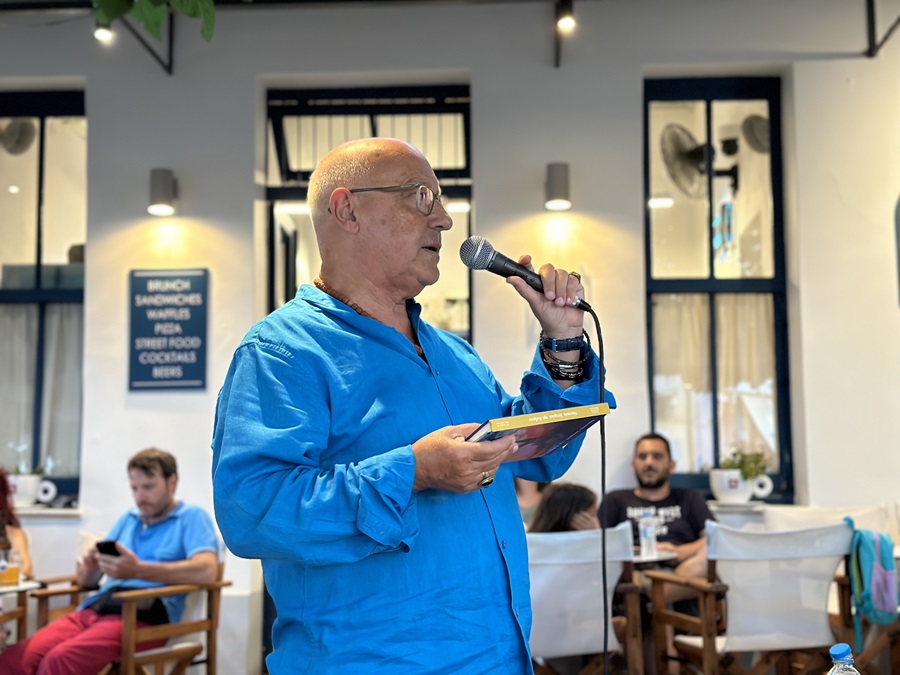 Από την παρουσίαση του βιβλίου Ναυτικές Ιστορίες στο κατάμεστο καφέ-μπαρ Norte στην πλατεία Καΐρη. Εδώ κατά την διάρκεια της ομιλίας του καθηγητή Μάριου Μπέγζου…