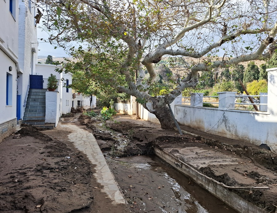 Ένα νέο ρέμα άνοιξε ξαφνικά με την βροχή κατά μήκος της πέτρινης μάντρας της οικίας. Το νερό διάλυσε την πόρτα βρήκε έξοδο και πέρασε πάνω από τον δρόμο κι όχι κάτω από το γεφύρι! Νέες καταστάσεις μετά την περσινή πυρκαγιά, που αποτέφρωσε την βλάστηση και δεν έγιναν αντιπλημμυρικά έργα από την Περιφέρεια και το Επαρχείο…