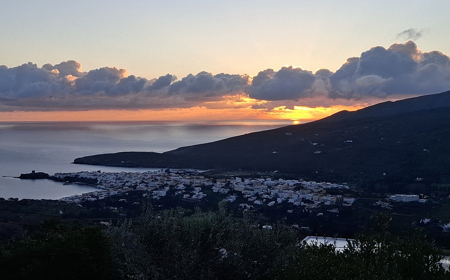 Και μετά πάλι ήλιος πάνω από το απέραντο γαλάζιο του Αιγαίου και την μουσκεμένη ακόμα Χώρα της Άνδρου. Χειμερινές εναλλαγές, από τις Αλκυονίδες στις καταιγίδες…