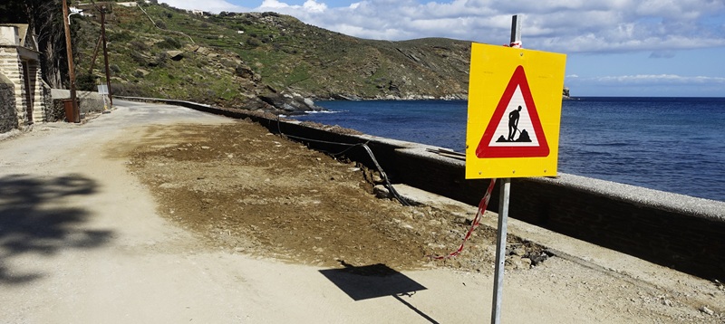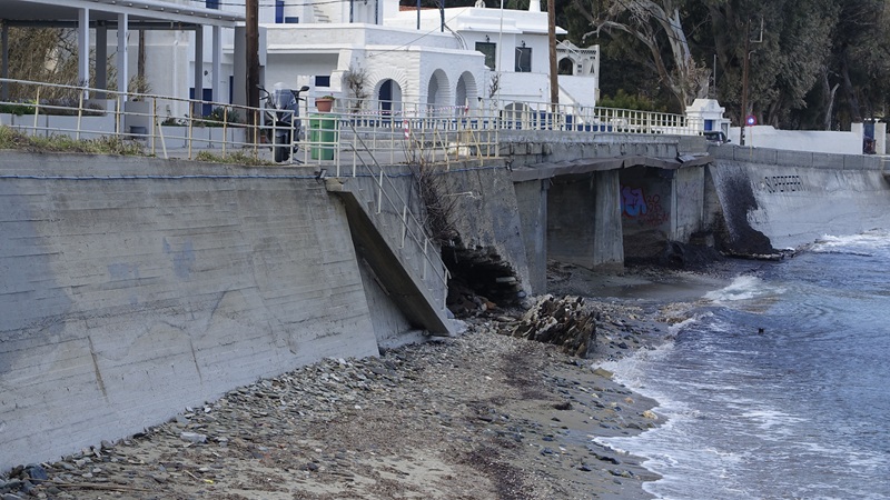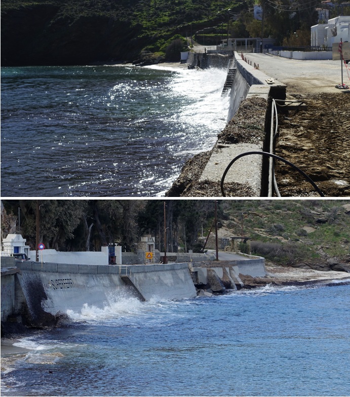 Η θάλασσα πήρε παραμάζωμα το πέτρινο τοιχίο, που υπήρχε κάτω από τον δρόμο λίγο πριν το γεφυράκι που περνά πάνω από το ρέμα των Στενιών μπροστά στο εστιατόριο “Τα Γυάλια”. Τώρα χρειάζεται σοβαρή θεμελίωση. Θα πρέπει να σκαφτεί βαθιά μέχρι να βρεθεί σταθερό έδαφος. Θα χρειαστεί τσιμεντένιο τοιχίο για να αντέξει την επόμενη φορά όταν η θάλασσα θα βγει τόσο έξω.