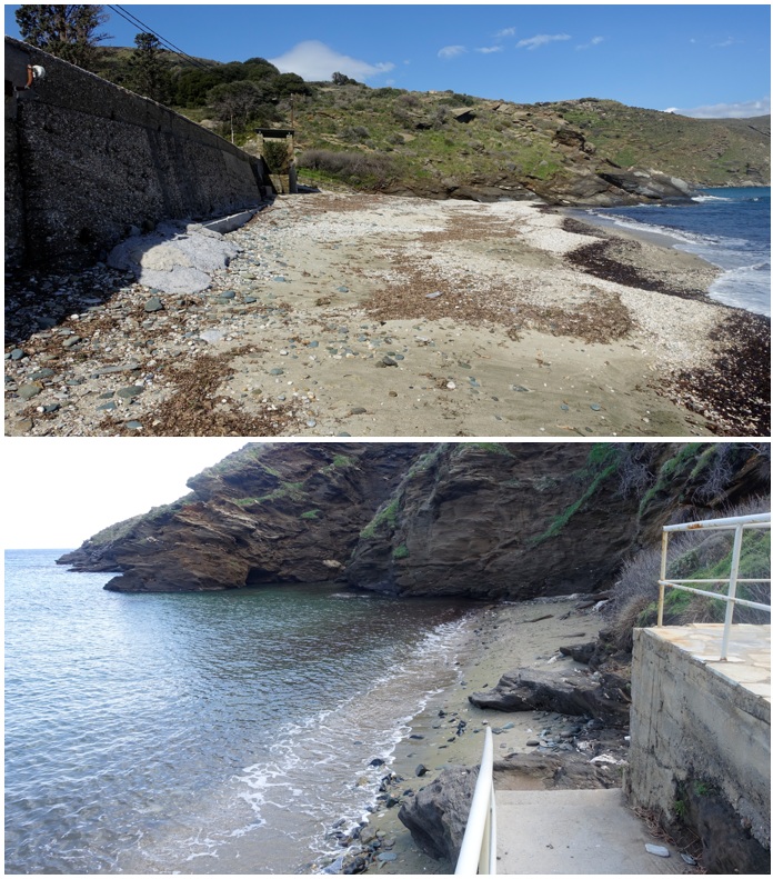 “Όταν η θάλασσα πήρε αμπάριζα την στεριά” χάθηκαν δύο παραλίες της Άνδρου: τα Γυάλια και ο Νειμποριός. Αυτός είναι ο τίτλος του φωτορεπορτάζ, αλλά κι αυτό είναι το συμπέρασμα από τις επί τόπου διαπιστώσεις. Το κολάζ των δύο παραπάνω φωτογραφιών με τις οποίες ανοίγουμε το θέμα της ξενάγησης στα Γυάλια, που υπέστησαν την τη δύναμη της φύσης, αλλά και στην αδυναμία των τεχνικών έργων μιας προηγούμενης εποχής.