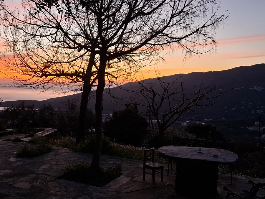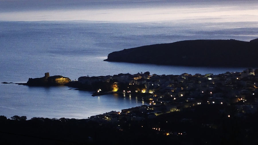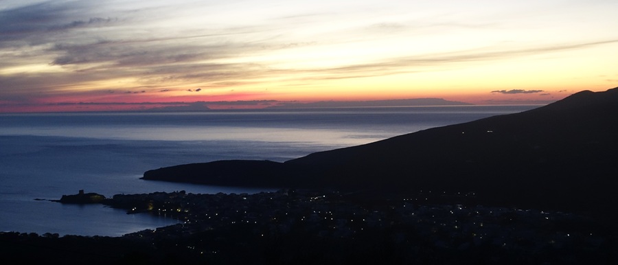 Ξημερώνει. Τελειώνει τυπικά και ο χειμώνας με τον Φεβρουάριο. Σε πρώτο πλάνο, στη φωτογραφία, η σκοτεινή Χώρα. Και στο βάθος του πελάγους η Σάμος και η Ικαρία. Έχει αυτό το καλό η Χώρα: να αντικρύζει πέρα το κεντρικό Αιγαίο και στο πρωινό να βλέπεις στο βάθος και νησιά του Ανατολικού Αιγαίου…