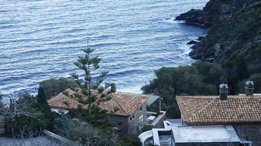 Και μπροστά χαμηλά η θάλασσα, στα Πίσω Γυάλια. Κυματώδης. Ταξιδιάρα. Και τα πέτρινα σπίτια. Κάποτε κατοικίες. Κάποτε AirBNB. Ένα ίχνος ανθρώπινο στην χειμερινή ερημιά της Άνδρου…