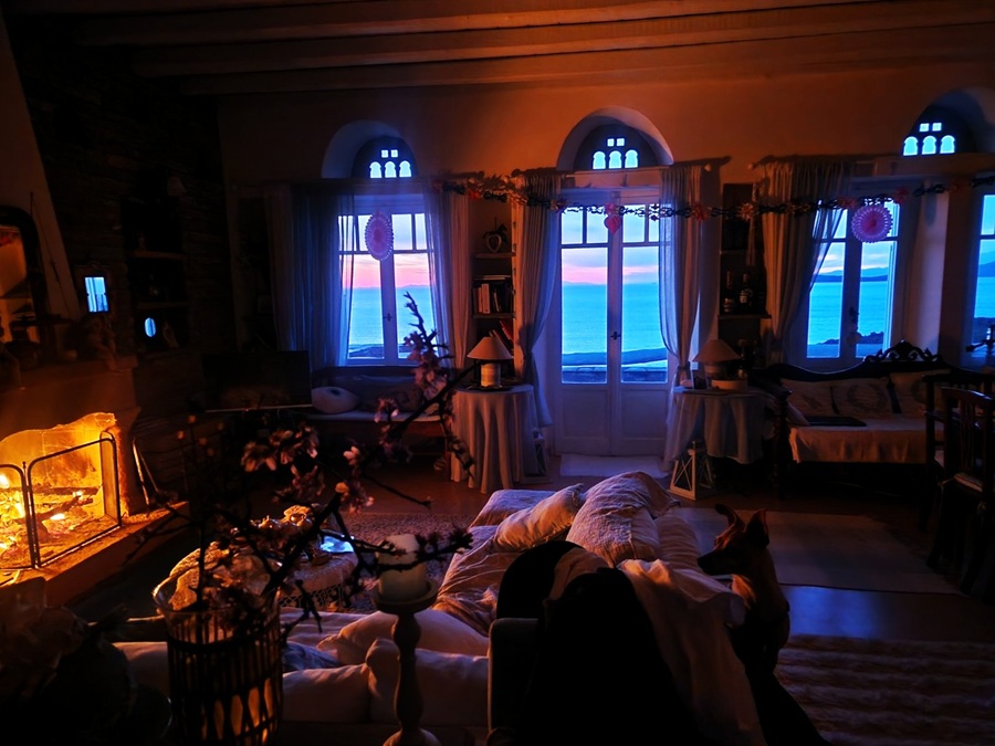 Εσωτερικό σπιτιού στα δυτικά του νησιού. Μέσα το τζάκι θερμαίνει. Κάπου στην Πούντα. Κι έξω η δύση που απλώνει μακριά κι απαλά σε χρωματισμούς ήπιους και γοητευτικούς. Πολύ διαφορετικούς από την εκρηκτική ανατολή της Χώρας…