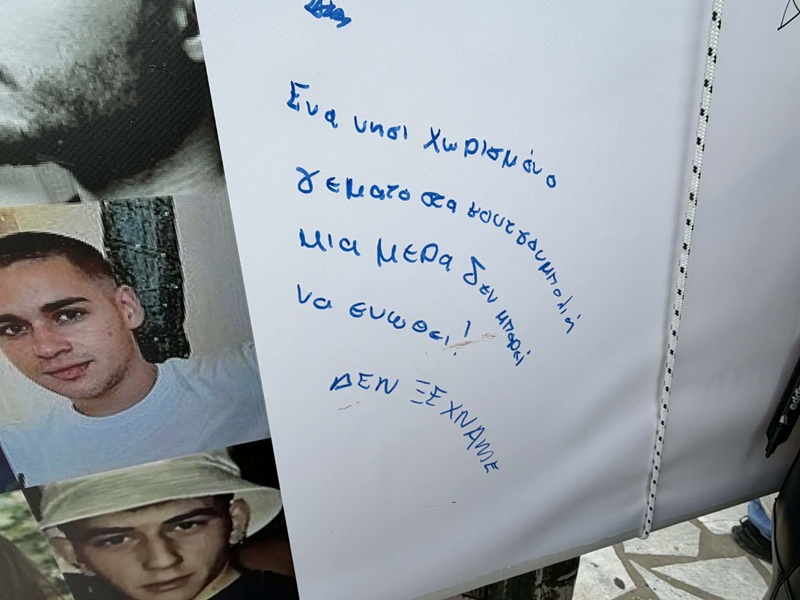 Μεταξύ άλλων καταγράφηκε και το σύνθημα: «Ένα νησί χωρισμένο, γεμάτο στα κουτσομπολιά, μια μέρα δεν μπορεί να ενωθεί… ΔΕΝ ΞΕΧΝΑΜΕ», αποτυπώνοντας τον προβληματισμό και την ανάγκη αυτοκριτικής της τοπικής κοινωνίας. Η συγκέντρωση ολοκληρώθηκε με το αίτημα για αλήθεια, δικαιοσύνη και ασφάλεια στις μεταφορές, με το μήνυμα ότι η μνήμη δεν αποτελεί τυπική τελετή, αλλά διαρκή ευθύνη.