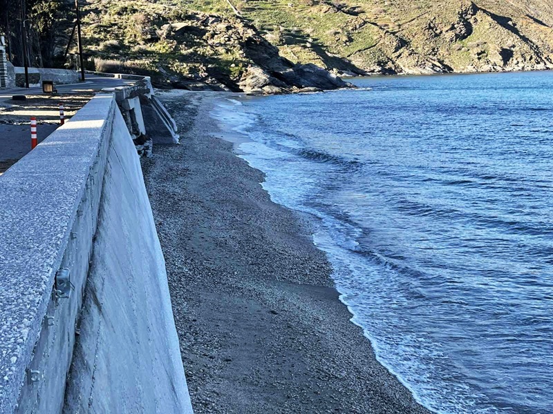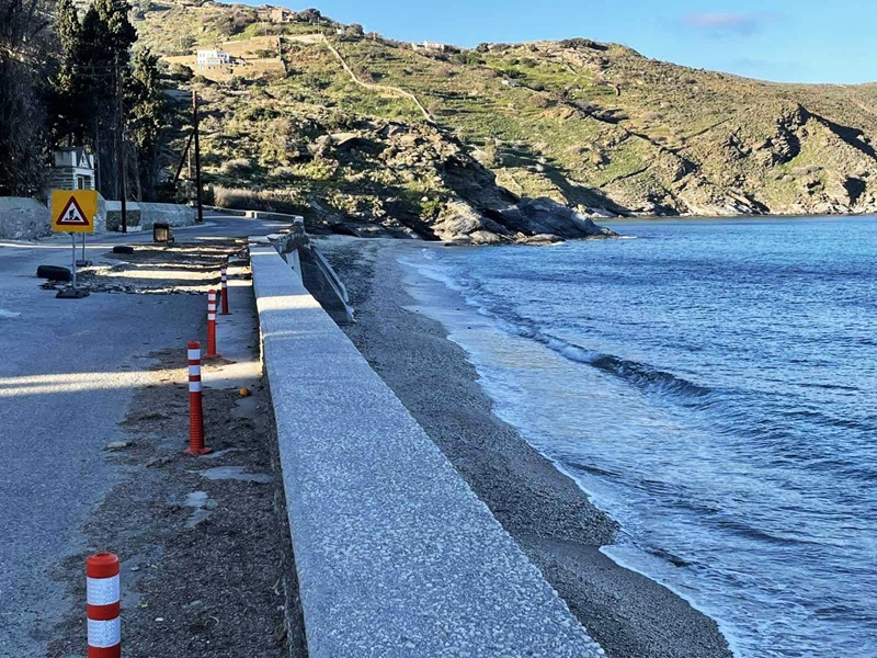 Βλέπουμε το σημείο που τα αγριεμένα κύματα και η άνοδος της στάθμης είχαν χτυπήσει με δύναμη και “έτρωγαν” τα σαθρά θεμέλια οδηγώντας σε σημαντική καθίζηση το οδόστρωμα του δρόμου δημιουργώντας κίνδυνο οδικής αποκοπής του χωριού των Στενιών από την Χώρα της Άνδρου.