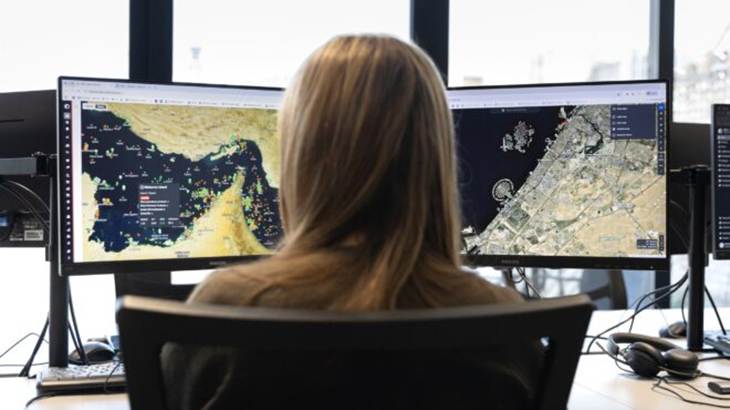 Αναλύτρια του Marine Traffic παρακολουθεί τις θέσεις των πλοίων στα Στενά του Ορμούζ (αριστερή οθόνη) και στις ακτές του Ντουμπάι (δεξιά). Φωτογραφία Σωκράτης Μπαλταγιάννης.