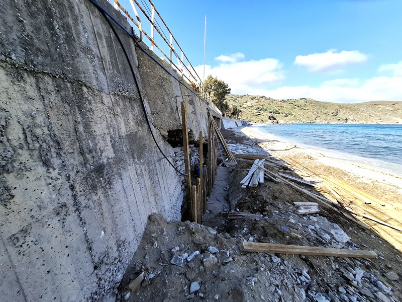 Πάμε τώρα στα “πληγωμένα”, αλλά εργωδώς επισκευαζόμενα (πειραματικώς;) Γυάλια. Και λέμε εργωδώς και πειραματικώς γιατί η επισκευές ξεκίνησαν “έτσι χωρίς σχέδιο ή μελέτη” από την πρώτη μέρα. Δια της μεθόδου: δοκιμή κι αποτυχία ή “βλέποντας και κάνοντας”! Με ποια μελέτη έγιναν όλα όσα έγιναν εδώ κι ένα μήνα; Άγνωστο. Μπορεί να υπήρξε μελέτη που να έλεγε “ρίξε μπάζα στην καθίζηση της θάλασσας κι από πάνω τσιμέντο”; Μάλλον δύσκολο. Γιατί τα μπάζα τα πήρε η θάλασσα κι η καθίζηση συνεχίστηκε…