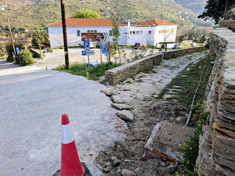 Παρεμπιπτόντως το “εργώδες” έργο άφησε μια πληγή στην ένωση με το ξεχασμένο, ημι-κατεστραμμένο, παλιό, παραδοσιακό μονοπάτι, που πάει στο Ανοιχτό Θέατρο και σε μια ολόκληρη γειτονιά της Χώρας. Μήπως στα πλαίσια του έργου μπορεί να γίνει κάποια μελέτη αποκατάστασης του; Μην το πλακώσει κι αυτό κανένας εργολάβος και το τσιμεντώσει; Αλλά να μην μείνει έτσι. Και τσακιστεί κανένας άνθρωπος. Ήρεμα ρωτάμε…