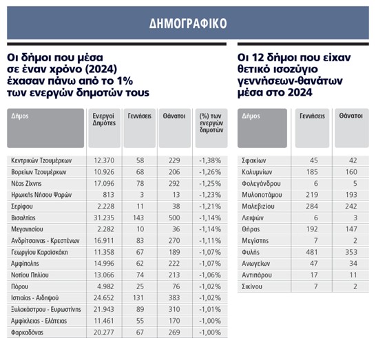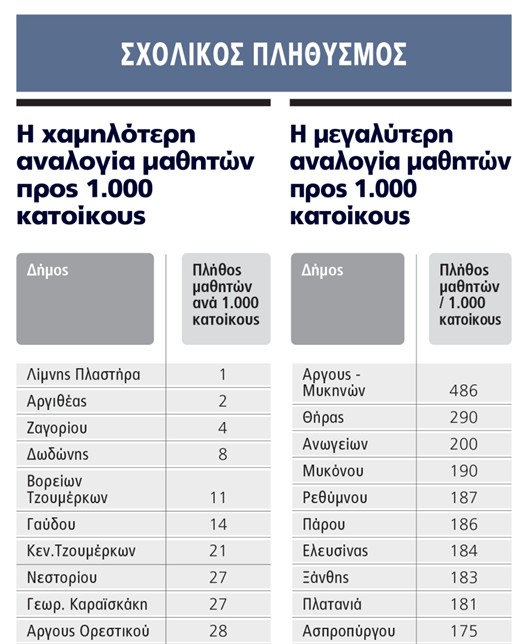 Η εικόνα γίνεται ακόμη πιο άσχημη για την χώρα όταν εξεταστεί η αναλογία μαθητών. Σε ορεινούς και απομονωμένους δήμους, όπως η Λίμνη Πλαστήρα και η Αργιθέα, αντιστοιχούν μόλις 1-2 μαθητές ανά 1.000 κατοίκους. Στον αντίποδα, σε δυναμικές περιοχές όπως το Αργος – Μυκήνες, η Θήρα και η Μύκονος, οι αριθμοί εκτοξεύονται, φτάνοντας μέχρι και τους 486 μαθητές ανά 1.000 κατοίκους. Βεβαίως, αυτό σημαίνει υπάρχει γήρανση του πληθυσμού σε πολλές περιοχές της χώρας, αλλά πάνε καλά τα τουριστικά και αστικά κέντρα.