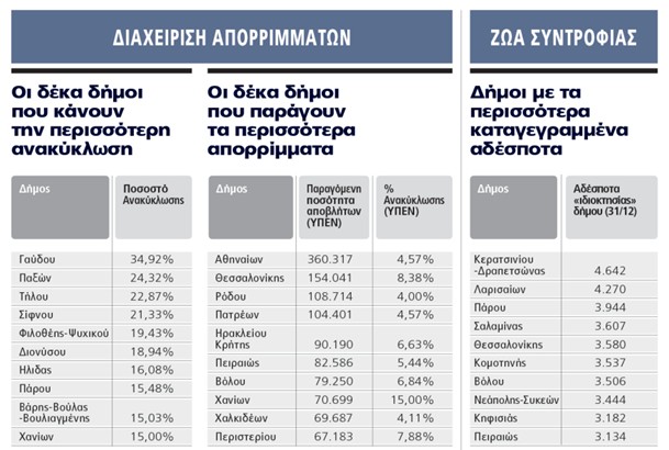 Στον τομέα της διαχείρισης απορριμμάτων, οι επιδόσεις δεν σχετίζονται απαραίτητα με το μέγεθος του δήμου. Μικροί νησιωτικοί δήμοι όπως η Γαύδος, οι Παξοί και η Τήλος καταγράφουν τα υψηλότερα ποσοστά ανακύκλωσης, φτάνοντας έως και το 34,9%. Αντίθετα, οι μεγάλοι αστικοί δήμοι εμφανίζουν χαμηλές επιδόσεις. Ο Δήμος Αθηναίων, παρότι παράγει τη μεγαλύτερη ποσότητα αποβλήτων (πάνω από 360.000 τόνους), ανακυκλώνει μόλις το 4,57%. Η εικόνα αυτή επαναλαμβάνεται και σε άλλες μεγάλες πόλεις, όπως η Θεσσαλονίκη, η Πάτρα και ο Πειραιάς, γεγονός που υπογραμμίζει τις δυσκολίες εφαρμογής αποτελεσματικών πολιτικών σε πυκνοκατοικημένες περιοχές.