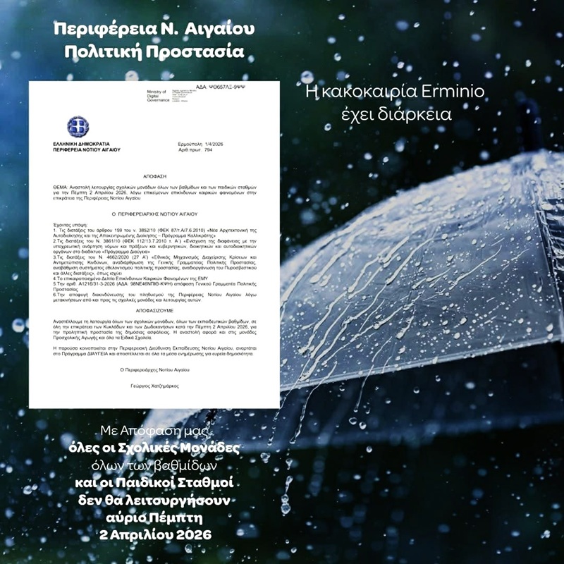 ΠΕΡΙΦΕΡΕΙΑ: ΚΛΕΙΣΤΑ ΤΑ ΣΧΟΛΕΙΑ ΚΑΙ ΤΗΝ ΠΕΜΠΤΗ ΛΟΓΩ ΣΥΝΕΧΙΣΗΣ ΤΗΣ ΚΑΚΟΚΑΙΡΙΑΣ