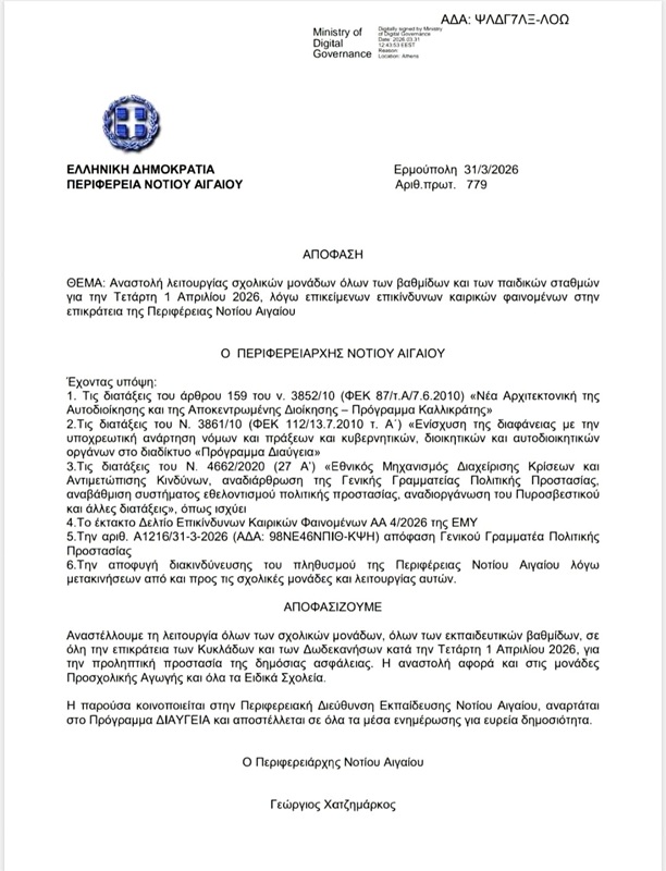 • ΠΕΡΙΦΕΡΕΙΑ: ΚΛΕΙΣΤΑ ΤΑ ΣΧΟΛΕΙΑ ΤΗΝ ΤΕΤΑΡΤΗ ΛΟΓΩ ΚΑΚΟΚΑΙΡΙΑΣ31/03/2026