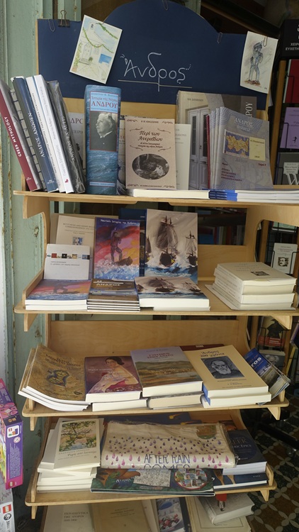 Άπλωσε και το βιβλιοπωλείο της Σοφίας και του Γιάννη την δική του πραμάτεια: βιβλία για την Άνδρο. Περάστε κόσμε…