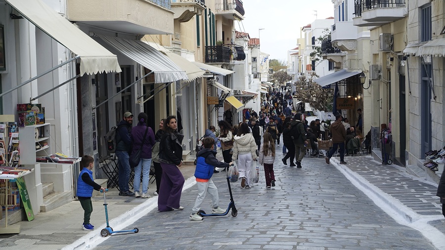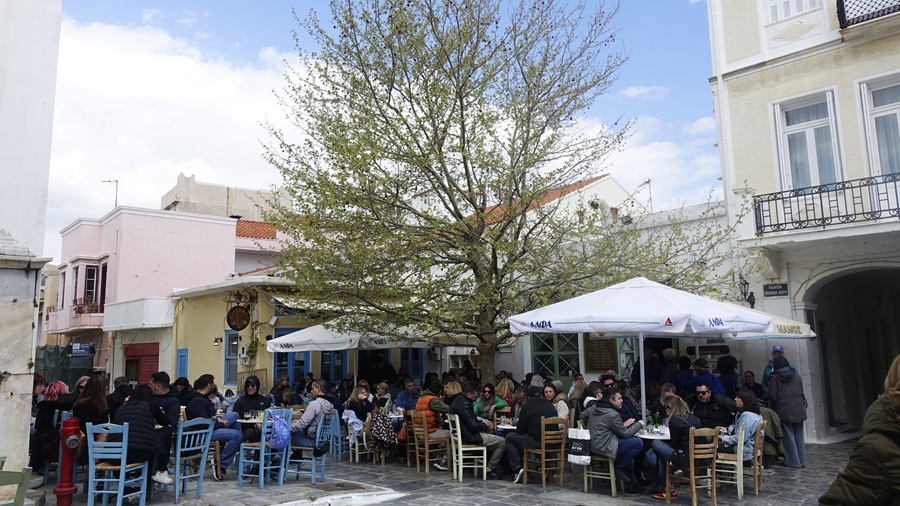 Μεγάλη Πέμπτη απομεσήμερο στην Χώρα. Επιτέλους γέμισε η Αγορά κόσμο. Κόσμος έφτασε και φτάνει. Εικόνα χαρμόσυνη σ’ ένα νησί που έζησε μοναχικά ολόκληρο χειμώνα, αλλά και τις πρώτες μέρες της Μεγάλης Εβδομάδας.