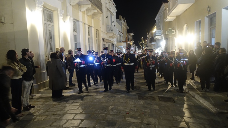 Η φιλαρμονική του ΜΟΥΣΑ παιανίζουσα τα εγκώμια πρωτοπορεί κι ακολουθούν οι επιτάφιοι με τις ψαλμωδίες και το πλήθος…