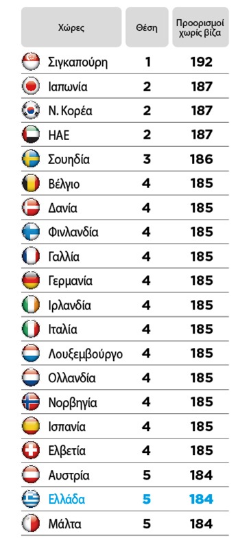 - Η Σιγκαπούρη καταλαμβάνει την 1η θέση με 192 visa free προορισμούς, η Ιαπωνία, η Νότια Κορέα και τα Ηνωμένα Αραβικά Εμιράτα τη 2η με 187 και η Σουηδία την 3η με 186.