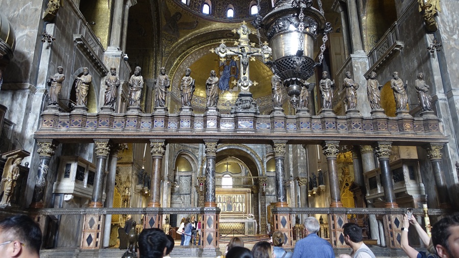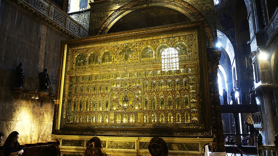 Η μεγάλη έκπληξη ήταν το “Pala D’ Oro”, το χρυσό τέμπλο-πάνελ πίσω από την Αγία Τράπεζα. Για να μπεις να το δεις πληρώνεις κάτι έξτρα στο εισιτήριο, αλλά αξίζει. Αποτελεί ένα από τα κορυφαία έργα βυζαντινής σμαλτοτεχνίας στον κόσμο. Όπως γράφει, περιέχει 187 σμάλτα και 1.927 πολύτιμους λίθους και συνδυάζει βυζαντινή, βενετσιάνικη και γοτθική τέχνη. Δημιουργήθηκε σταδιακά από τον 10ο έως τον 14ο αιώνα. Ξεκίνησε από τους βυζαντινούς τον 10ο αιώνα κι ολοκληρώθηκε το 1345 από τον δόγη Andrea Dandolo.