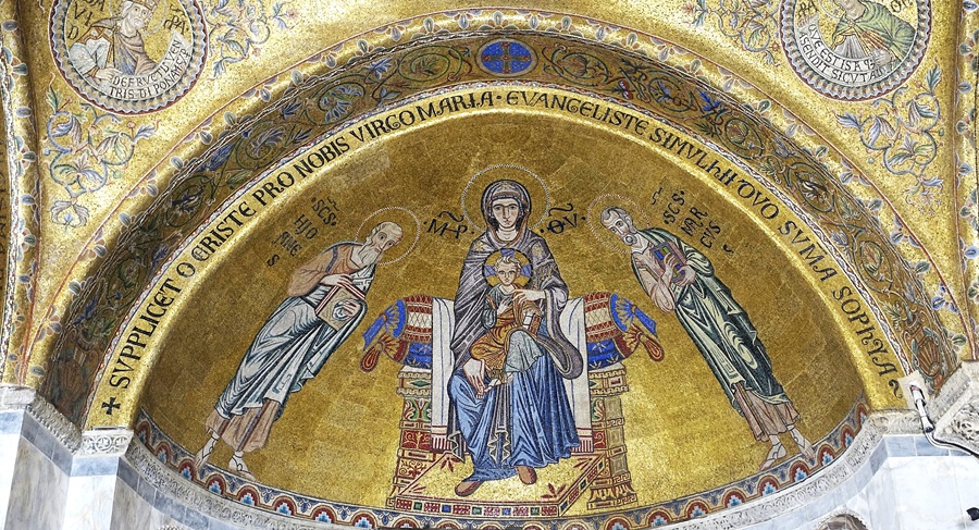 Βγαίνοντας στον πλαϊνό πρόναο και βαδίζοντας προς την έξοδο έμεινα να κοιτώ το βυζαντινό ψηφιδωτό της Παναγίας με το Θείο Βρέφος και την βυζαντινή ελληνική γραφή του και άθελα μου συγκινήθηκα. Τα στοιχεία ενός άδηλου οικουμενικού ελληνισμού ήταν αποτυπωμένα στην είσοδο, στον κυρίως ναό, αλλά ακόμα και στην έξοδο του Αγίου Μάρκου.