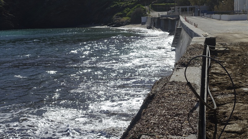 Πάμε και στο πέτρινο παλιό τοιχίο που υπήρχε στην αρχή του παραλιακού δρόμου, εκεί που καταλήγει η στροφή στην ακτή. Μέχρι εκεί που είναι δεμένα τα σχοινιά στον πέτρινο τοίχο ήταν άμμος και βότσαλα. Με τα σχοινιά ήταν δεμένες τρεις βάρκες που κάτοικοι είχαν τραβήξει για τον χειμώνα στην ακτή. Πάει και η άμμος, πάνε και τα βότσαλα, πάνε και οι τρεις βάρκες. Τα πήρε όλα η θάλασσα. Οι ιδιοκτήτες τους βρήκαν μόνο τα σχοινιά με τα οποία ήταν δεμένες στον πέτρινο τοίχο. Πάει και η πέτρινη βάση που ήταν δύο χτιστές καμπίνες για να αλλάζουν οι λουόμενοι. Τώρα θα πρέπει να φτιαχτεί τσιμεντένιος ο τοίχος και μετά θα περιμένουν όλοι να φέρει η θάλασσα κάτι από την παραλία που πήρε!…